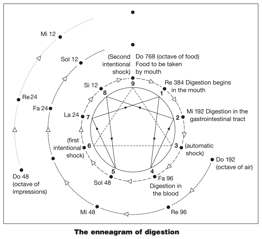 Efforts to remember oneself, observation of oneself at the moment of receiving an impression, observation of one's impressions at the moment of receiving them, registering, so to speak, the reception of impressions and the simultaneous defining of the impressions received, all this taken together doubles the intensity of the impressions and carries do 48 to re 24. At the same time the effort connected with the transition of one note to another and the passage of 48 itself to 24 enables do 48 of the third octave to come into contact with mi 48 of the second octave and to give this note the requisite amount of energy necessary for the transition of mi to fa. In this way the 'shock' given to do 48 extends also to mi 48 and enables the second octave to develop. (ISOM 190)